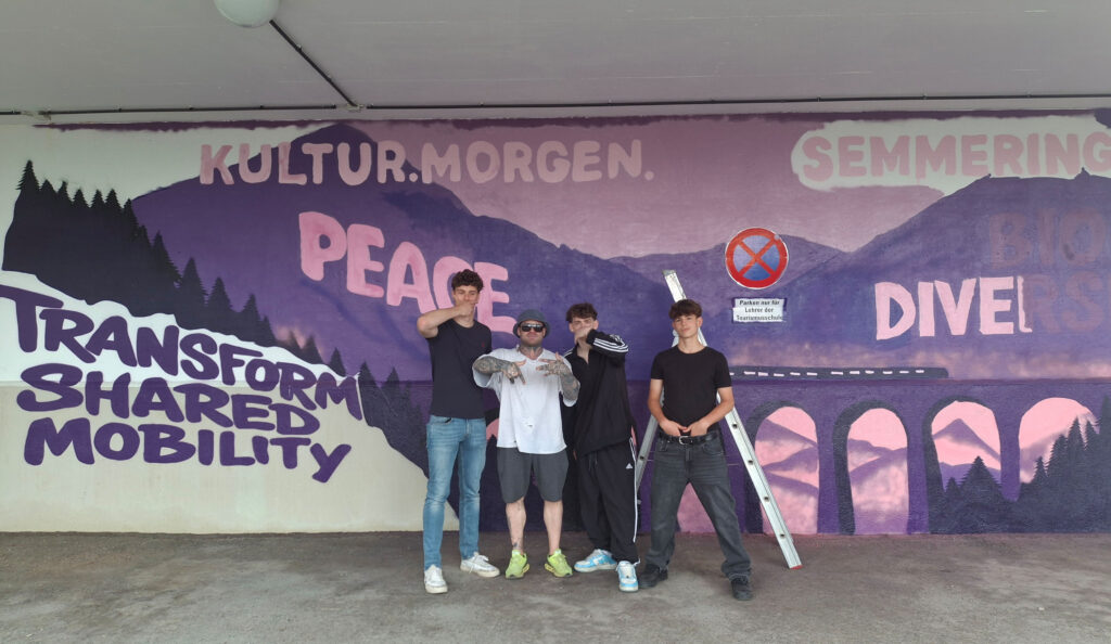 Ein weiteres Highlight: die „Semmering Wall of Vision“. Unter dem Motto „Kultur.Morgen.Semmering“ gestalteten Schüler*innen gemeinsam mit Graffiti-Künstler Jakob Pogats und ihrer Lehrerin, „Kunst- und Kulturbotschafterin“ Heidi Prüger, ein großflächiges Wandbild gegenüber dem Kulturpavillon. Die Wand reflektiert zentrale Zukunftsthemen wie Biodiversität, Mobilität und Nachhaltigkeit – und lädt dazu ein, den Semmering als Ort des kulturellen Aufbruchs zu denken.