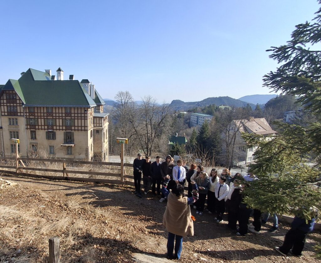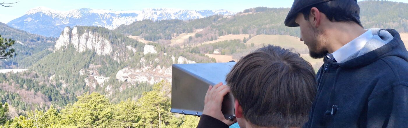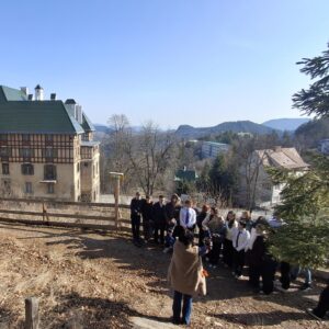 Die Klasse 3HF machte sich am 10.3. auf eine Reise durch Semmerings Natur und Geschichte. Nach einem Informationsinput im Klassenzimmer führte der Weg zunächst vorbei an den Traumvillen zum legendären Südbahnhotel. Dort erwartete die Gruppe Kulturführerin Ulli Tonn, die das frühere Leben am Semmering lebendig werden ließ. So erfuhren die Schüler:innen, dass die Hochstraße einst geölt wurde, um die Staubbelastung zu reduzieren. Ein Friedhof wurde bewusst nicht angelegt – aus Sorge um die außergewöhnlich gute Wasserqualität der Region. Auch die mächtigen Steinquader aus dem Bau der Semmeringbahn fanden eine weitere Verwendung und wurden beim Bau von Villen und anderen Gebäuden genutzt. Besonders geheimnisvoll klang die Erzählung über einen unterirdischen Gang vom Waldhof zum Südbahnhotel, der eine direkte Verbindung zwischen den Häusern ermöglichte.