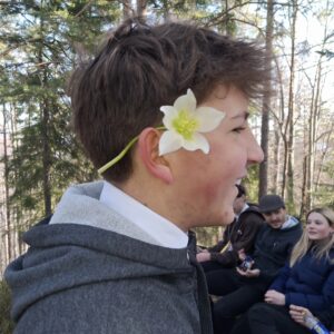 Anschließend führte der Weg weiter durch den Wald, der unweigerlich an Goethes Osterspaziergang erinnerte. Der Frühling ist hier bereits spürbar: Schneerosen, Seidelbast und Erika setzen erste Farbakzente zwischen Moos und Nadeln. „Was ist das für eine Blume?“, fragte eine Schülerin, als sie am Weg eine gepflückte Schneerose fand – ein schöner Moment, der zeigt, wie wichtig es ist, jungen Menschen die Vielfalt ihrer natürlichen Umgebung näherzubringen. Übrigens: Die Region Semmering–Rax–Schneeberg ist ein bekanntes Gebiet mit großen Schneerosen-Beständen. Gerade deshalb wird dort von Naturschutzorganisationen besonders darauf hingewiesen, die Pflanzen nur anzuschauen und zu fotografieren.