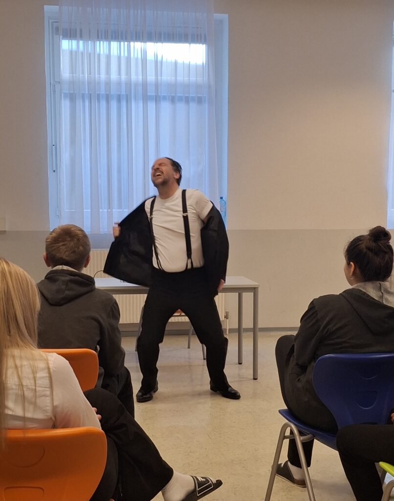 „Der Spätsommer war lau, und die Türe zum Klassenzimmer stand offen.“ – Mit diesen Worten beginnt „Der Schüler Gerber“ von Friedrich Torberg – und öffnet zugleich einen Raum für Fragen, die bis heute nichts an Aktualität verloren haben. Im Rahmen des Klassenzimmertheaters gastierte das Landestheater Niederösterreich wieder einmal an den Tourismusschulen Semmering und brachte die eindringliche Geschichte von Kurt Gerber direkt zu den Schüler:innen. Ohne große Bühne, ohne Distanz – dafür mit umso größerer Intensität. In der Inszenierung des Romans als Monolog fast ohne Requisiten spielt Schauspieler Sven Kaschte mit viel Witz und Ernst und unglaublicher Wandlungsfähigkeit alle Rollen selbst, bindet aber auch aktiv das junge Publikum mit ein.